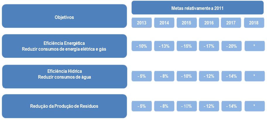 A redução dos consumos de água, energia e produção de resíduos são objetivos específicos do PEBC (Plano Estratégico do Baixo Carbono) & Eco.AP (Programa e Eficiência Energética na Administração Pública) no Ministério da Saúde, para os quais são estabelecidas metas, no contexto dos despachos anuais, incluindo o mais recente 4128/2017, de 3 de maio.